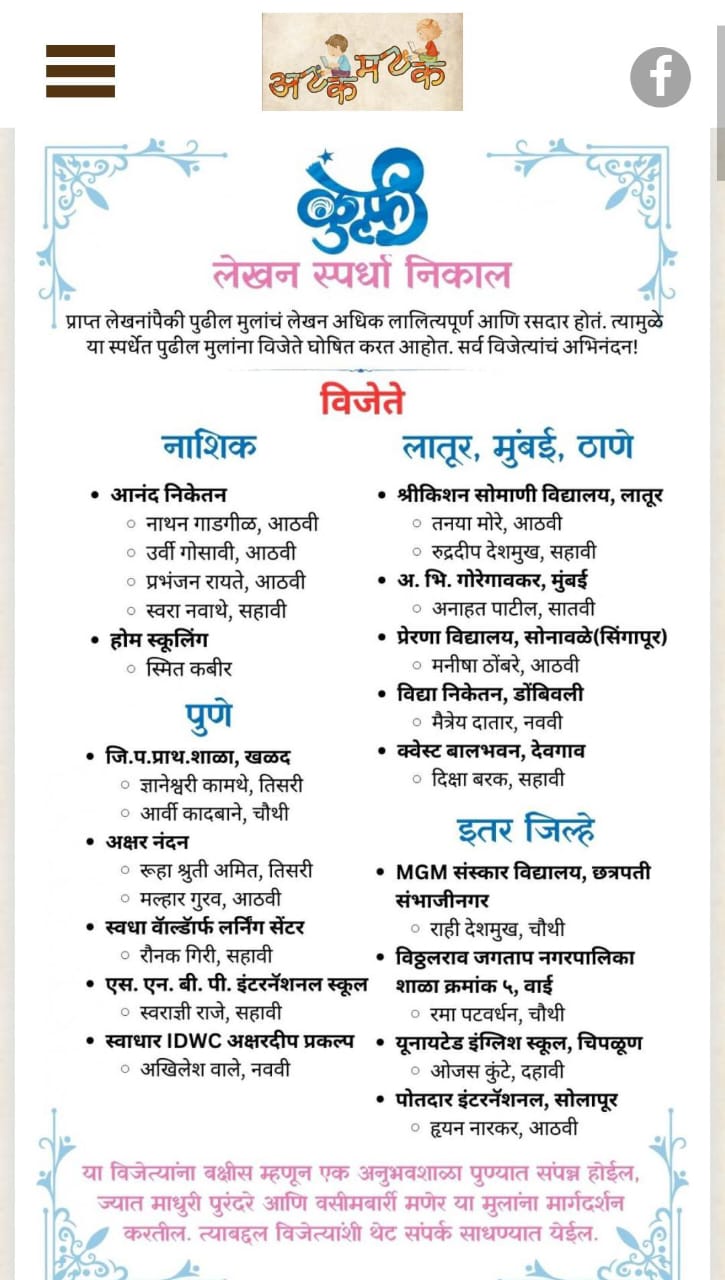 'कुल्फी'त्रैमासिकाने घेतलेल्या 'लिहिते व्हा!' या स्पर्धेत इयत्ता सहावी वर्गातील चि.रुद्रदीप देशमुख आणि इयत्ता आठवी वर्गातील कु.तनया मोरे या दोघांची निवड झाली आहे. विजेत्यांना बक्षीस म्हणून पुण्यात होणाऱ्या अनुभवशाळेत उपस्थित राहण्याची संधी मिळणार आहे. यात प्रसिद्ध लेखिका माधुरीताई पुरंदरे आणि वसीमबार्री मणेर मार्गदर्शन करणार आहेत. विद्यालयात मुख्याध्यापकांनी विद्यार्थ्यांचे अभिनंदन केले.💐💐