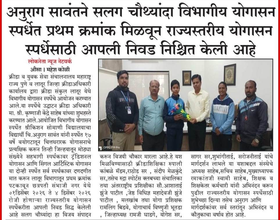 दि. 4 डिसेंबर 2025 रोजी छत्रपती संभाजीनगर येथे झालेल्या राज्यस्तरीय शालेय पारंपारिक व आर्टिस्टिक योगासन क्रीडा स्पर्धेमध्ये विद्यालयातील विद्यार्थी चि.अनुराग सावंत याने आपला उत्स्फूर्त सहभाग नोंदविल्याबद्दल संस्था व विद्यालयाच्यावतीने मुख्याध्यापक रमाकांत स्वामी यांनी हार्दिक अभिनंदन केले.💐💐💐