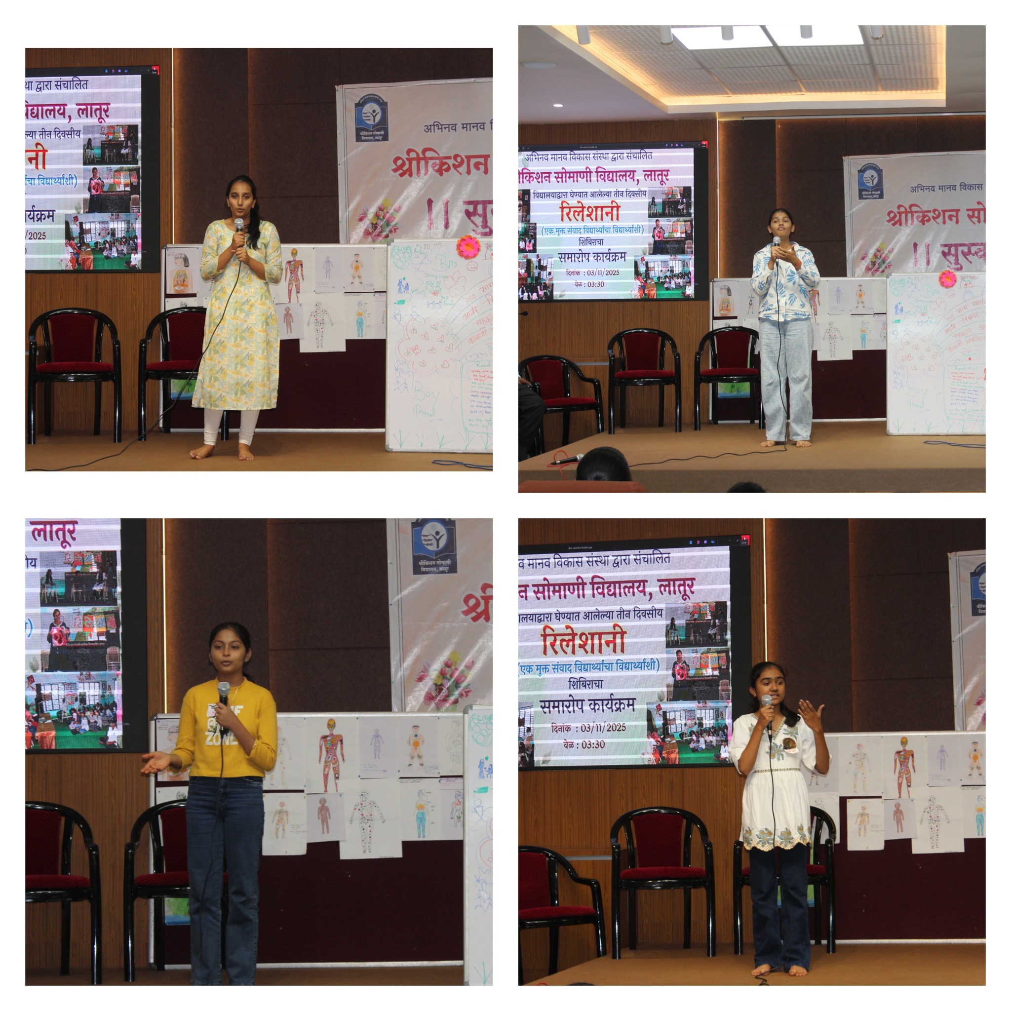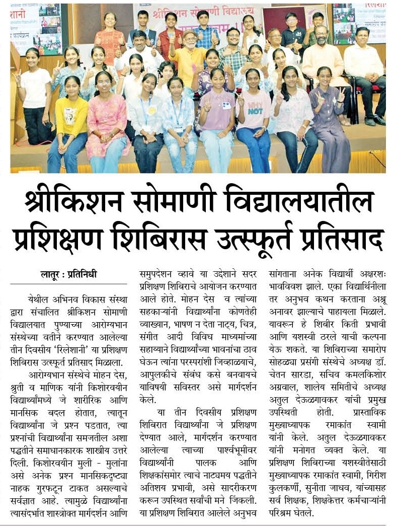 १ ते ३ नोव्हेंबर २०२५ - विद्यालयात आरोग्यभान संस्थेतर्फे डॉ. मोहन देशपांडे, श्रुती भिडे व माणिक पारधे यांनी विद्यार्थ्यांना नातेसंबंधाचे महत्व विशद करणारे "रीलेशानी-शानदार रिलेशनशिप" शिबीर घेण्यात आले.